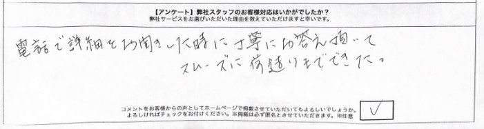 オペレーターさんの説明がとても分かりやすかったです。この会社なら信頼できると思い選ばせていただいました。