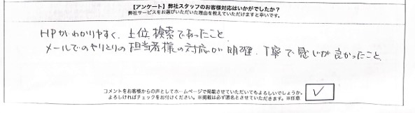 HPがわかりやすく、上位検索であったこと、メールでのやりとりの担当者様の対応が明確・丁寧で感じが良かったこと。