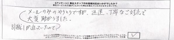 引っ越しが迫っていたので、メールのみのやりとりですが、迅速、丁寧なご対応で大変助かりました。