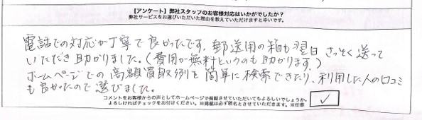 電話での対応が丁寧で良かったです。郵送用の箱も翌日さっそく送っていただき助かりました。(費用が無料というのも助かります。)ホームページでの高額買取例を簡単に検索...